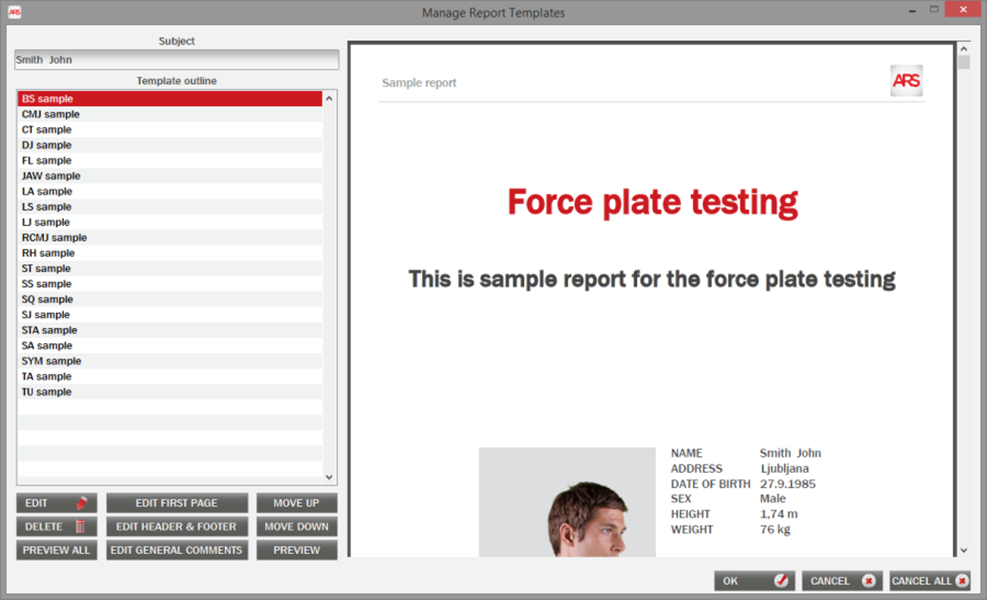 Reports present a very important part of any diagnostics as they contain crucial information for coaches, athletes or patients. Reports contain the current state and guidelines for future work to address the diagnosed deficits. Each ARS module allows immediate report generation based on built-in templates. The user can modify the existing templates or create their own with custom logos and layouts.